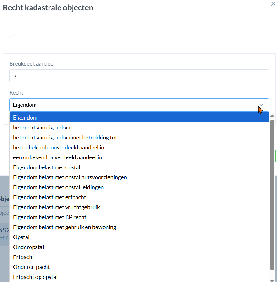 Daarnaast kun je het type recht selecteren, zoals bijvoorbeeld het recht van erfpacht. Zorg ervoor dat de ingevoerde gegevens overeenkomen met de juridische situatie, zodat het object correct wordt verwerkt in de akte.