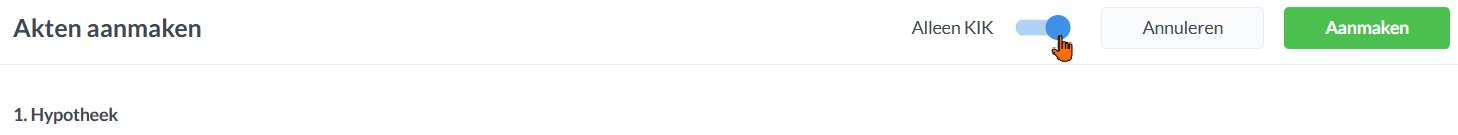 Om een hypotheekakte aan te maken, klik je bovenin het dossier op ‘Aanmaken’ en vervolgens op ‘Document’. In het volgende scherm kies je het gewenste hypotheekmodel. Als je alleen KIK-modellen wilt zien, zet je het schuifje ‘Alleen KIK’ aan.