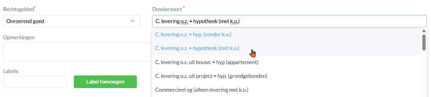 Zodra je dit rechtsgebied hebt gekozen, worden automatisch passende dossiersoorten gegenereerd. Deze dossiersoorten bevatten standaard zaaksoorten zoals levering of hypotheek. Als deze gekoppeld zijn, worden ze automatisch toegevoegd. Selecteer de zaaksoorten die relevant zijn voor de akten die je gaat opstellen.