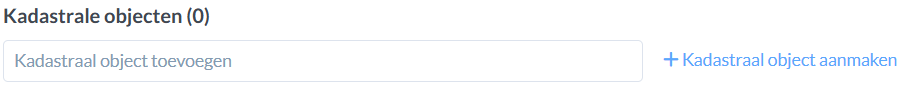 In dit scherm voeg je ook de kadastrale objecten toe. Klik op ‘Kadastraal Object toevoegen’ en typ het object in als het al bestaat in Nobilex. Als het object nog niet is aangemaakt, kun je hier lezen hoe je dit kan doen.