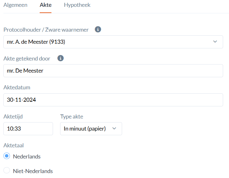 In het tabblad ‘Akte’ geef je aan wie de protocolhouder is en wie de akte tekent. Als de protocolhouder al op dossierniveau is ingevuld, wordt dit vaak automatisch overgenomen in de zaak. Vul hier ook de aktedatum in, deze is belangrijk voor het opstellen van de akte.