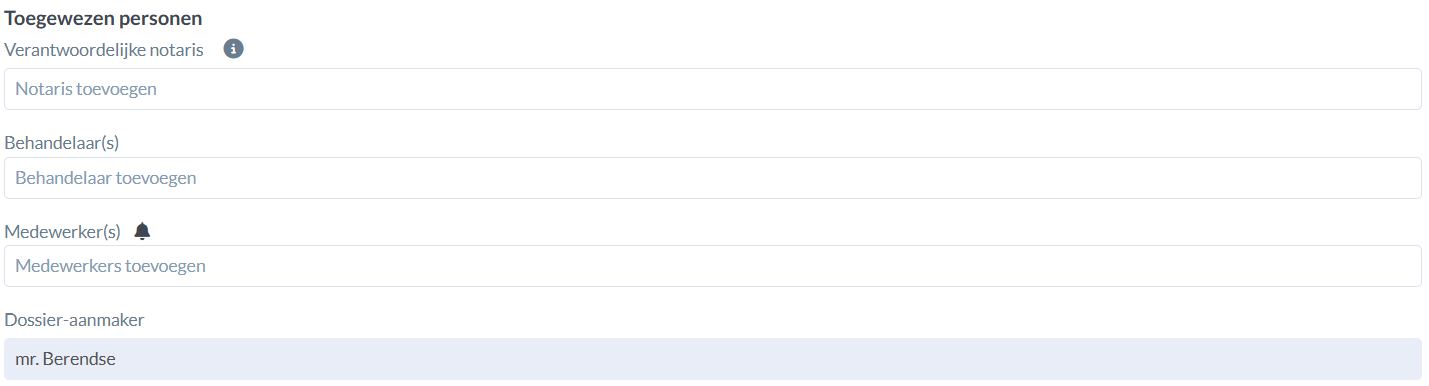 Je kunt een verantwoordelijke notaris selecteren, maar kan ook later worden toegevoegd. De behandelaar is de medewerker die het dossier inhoudelijk gaat behandelen. De personen die bij Medewerker worden ingevuld krijgen notificaties te zien over het dossier.