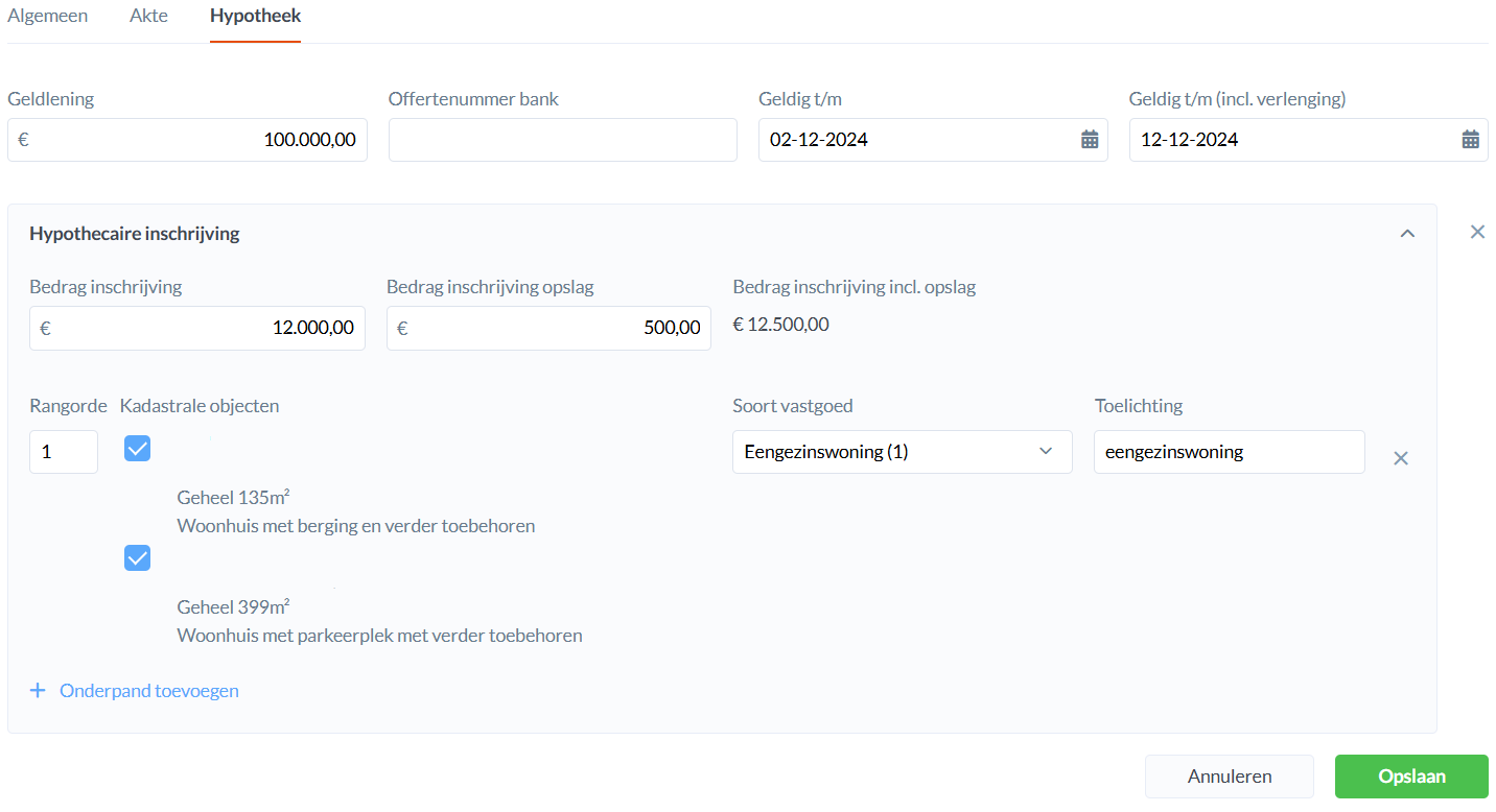 In het tabblad ‘Hypotheek’ vul je de gegevens in over de geldlening en de hypothecaire inschrijving. Het onderpand voeg je toe in het veld van de hypothecaire inschrijving. Hier geef je ook de rangorde aan, vink je het kadastrale object aan en licht je toe om wat voor soort vastgoed het gaat. Deze gegevens worden gebruikt bij het genereren van de akte.