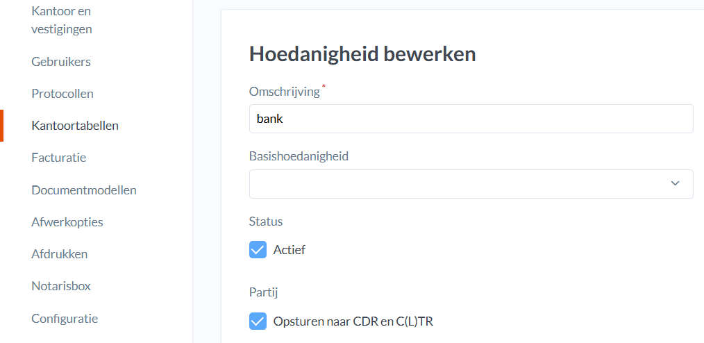 - Ga naar Kantoorbeheer → Kantoortabellen → Hoedanigheden