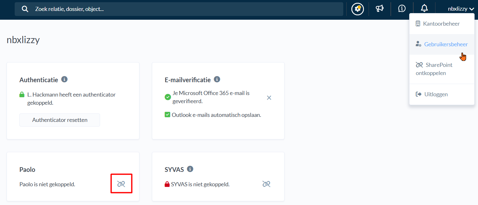 Om de koppeling te maken klik je rechtsboven op je gebruikersnaam en ga je naar Gebruikersbeheer. Hier zie je het tegeltje van PaoloKYC staan met een koppelteken. Klik hier op en log in. Daarna is Paolo succesvol gekoppeld.